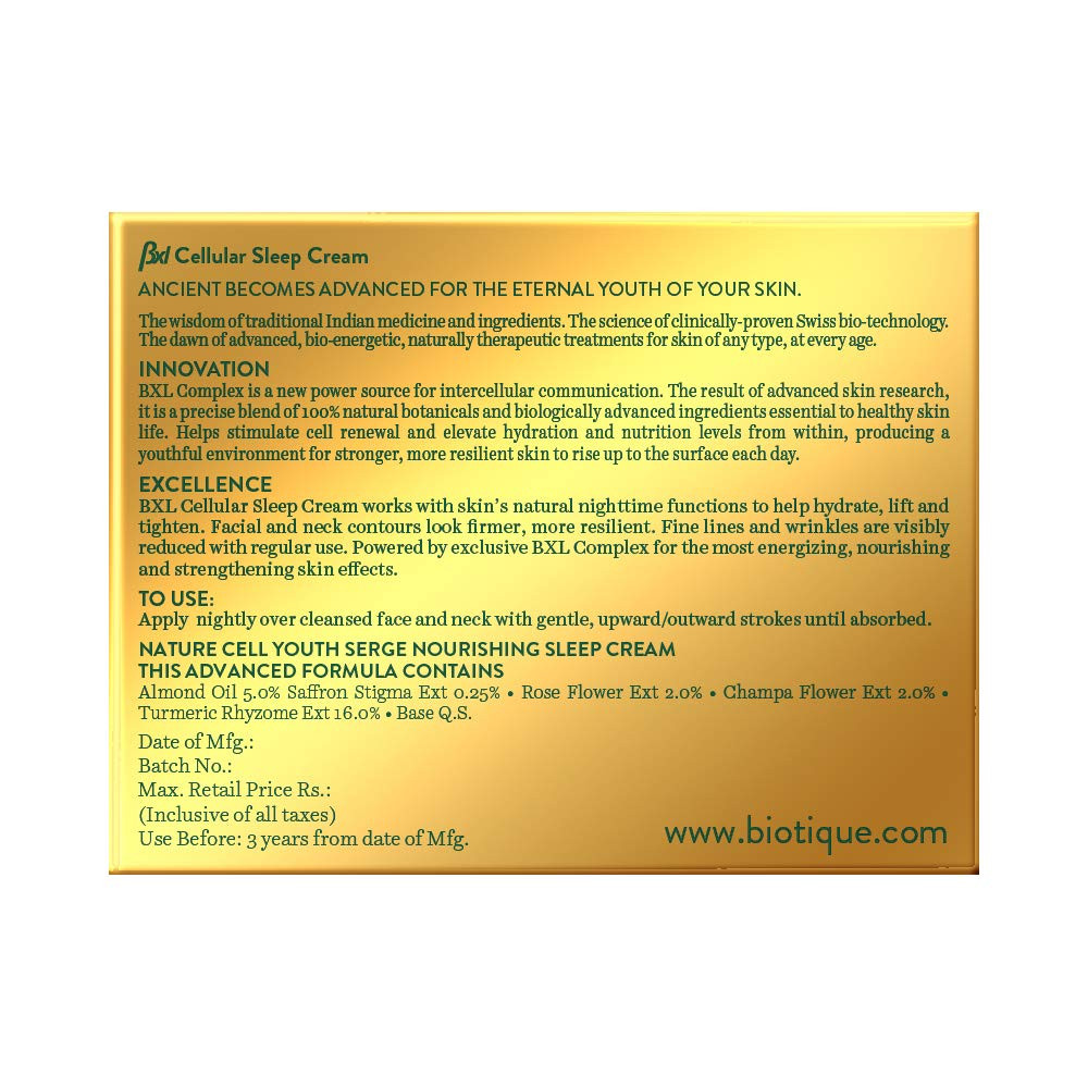 Biotique Bio Wheat Germ Sleep Cream - BXL Cellular, 50 g, is a luxurious and rejuvenating night cream designed to nourish and revitalize your skin while you sleep. Formulated with the goodness of wheat germ and other natural ingredients, this cream works overnight to replenish and restore your skin's vitality.