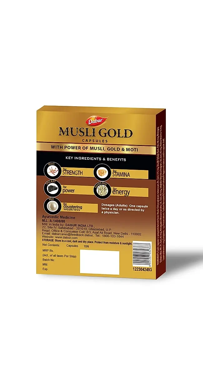 • Enhanced Vitality: Dabur Musli Gold is enriched with Musli, a renowned adaptogenic herb known to boost energy levels and stamina, promoting vitality and vigor.