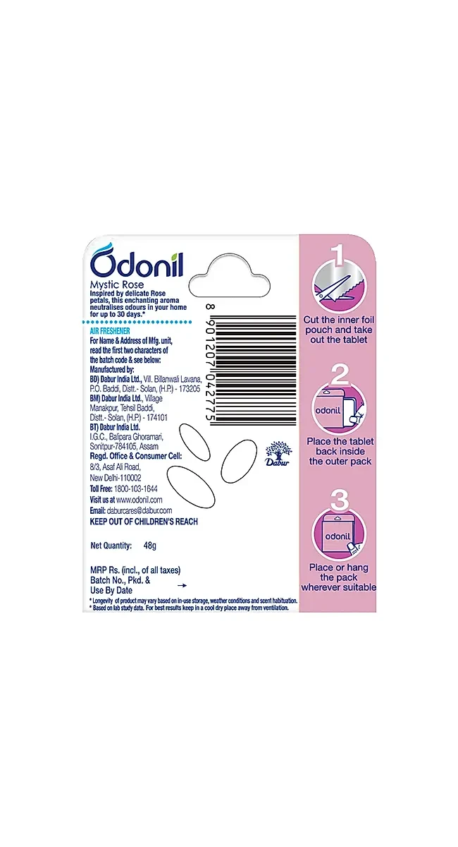 • Odonil Blocks 48gm Mystic Rose contain a proprietary blend of fragrances and odor-neutralizing agents to ensure effective odor elimination and a long-lasting Mystic Rose scent.