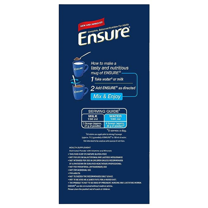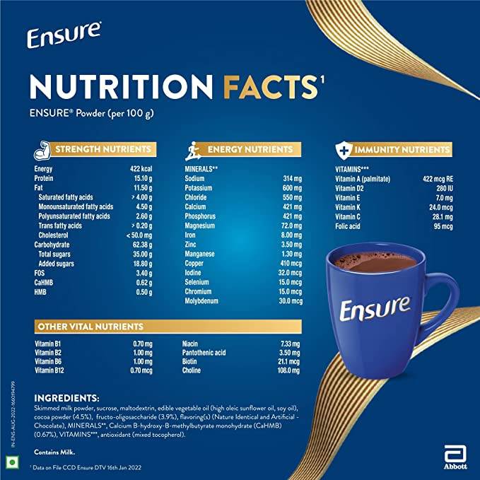 • Comprehensive Nutrition: Ensure Chocolate Flavour Powder is a balanced blend of vitamins, minerals, carbohydrates, proteins, and fats, making it an ideal choice for daily nutrition.