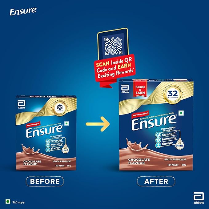 Ensure Chocolate Flavour Powder for Adults, now fortified with HMB (Beta-Hydroxy Beta-Methylbutyrate), offers a complete nutritional solution in a convenient 200g pack. This dietary supplement is thoughtfully crafted to provide essential vitamins, minerals, and macronutrients, supporting your overall health and well-being.