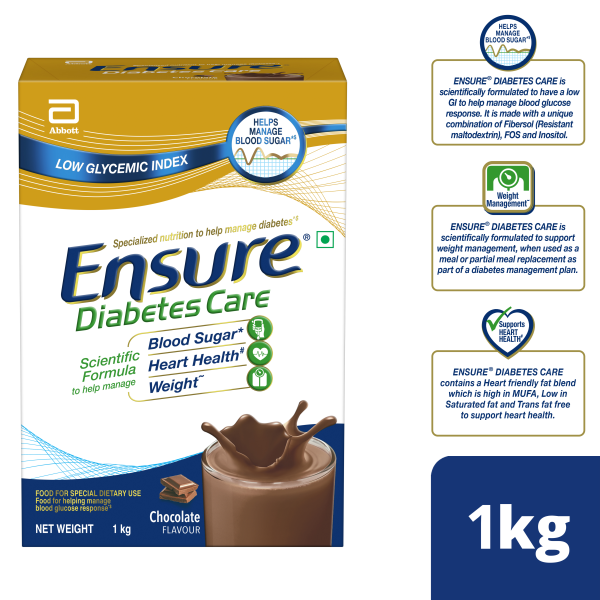 Introducing Ensure Diabetes Care Chocolate Flavour Powder, a purposeful solution for adults managing diabetes. In a generous 1kg pack, this powder offers a delectable and convenient way to support your nutritional needs while relishing the rich taste of chocolate. Let's delve into the details: