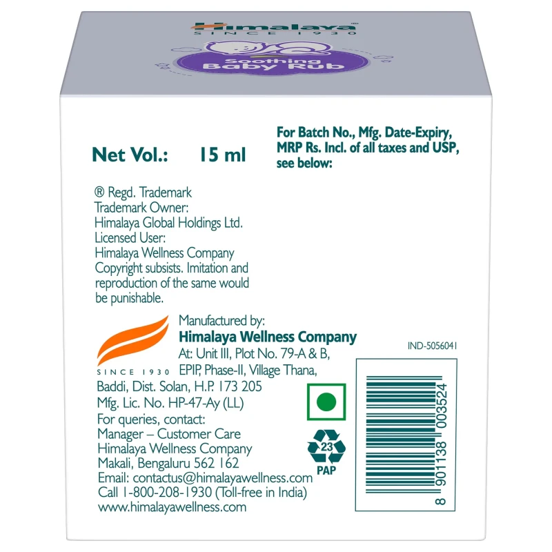 Himalaya Soothing Baby Rub 15ml is a gentle and nurturing solution for your baby's well-being. Created with utmost care and enriched with natural ingredients, this baby rub provides comfort and relaxation for your little one. Its compact size makes it perfect for on-the-go use, ensuring your baby's comfort no matter where you are.