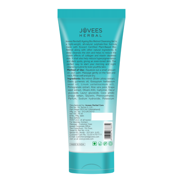 Experience the rejuvenating effects of JOVEES HERBAL Bio-Retinol Revita Ageing Cleansing Gel. Enriched with Eco-Certified Bio-Retinol, pomegranate, and aloe vera extracts, this formulation targets fine lines and wrinkles, offering a revitalizing cleanse for a more youthful appearance.