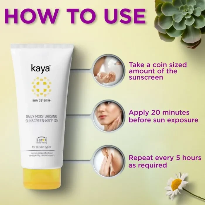 • Apply a generous amount of Kaya Daily Use Sunscreen SPF30 on cleansed skin, at least 15 minutes before sun exposure.