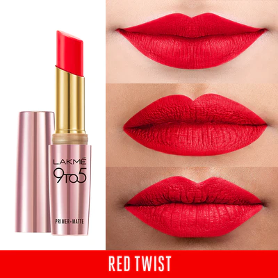 Lakmé 9 TO 5 PRIMER + MATTE LIP COLOR in Red Twist (3.6g) is your key to achieving captivating and confident lips that exude energy and glamour. This lipstick seamlessly blends a smooth primer and rich matte color, ensuring your lips stay alluring and vibrant throughout the day. Whether you're gearing up for power meetings or planning an evening out, Red Twist is the perfect shade to achieve captivating lips in a stunning red twist hue.