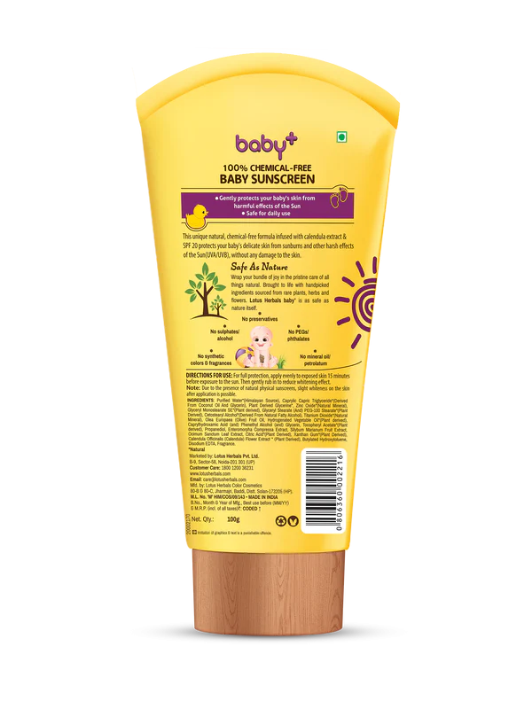 Lotus BABY+ SUNSCREEN SPF 20 PA+++ 100g is enriched with a blend of natural and effective ingredients, including: