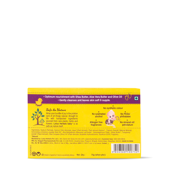 Lotus Herbals BABY LITTLE Bubbles Gentle Bathing Soap 75g features a blend of natural and effective ingredients, including: