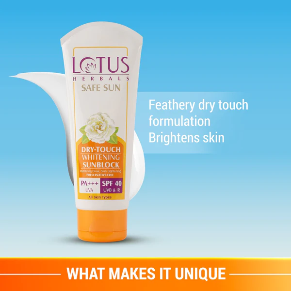 Lotus Safe Sun Dry-Touch Whitening Sunscreen SPF 40 PA+++ 100g is your perfect solution for comprehensive sun protection with an added benefit of skin whitening. This sunscreen combines SPF 40 and a high PA+++ rating to effectively shield your skin from the harmful effects of UV rays. With its unique dry-touch formula, it ensures a non-greasy feel, making it ideal for daily use. Enjoy sun protection that promotes a brighter and more even skin tone, making it an essential addition to your daily skincare routine.