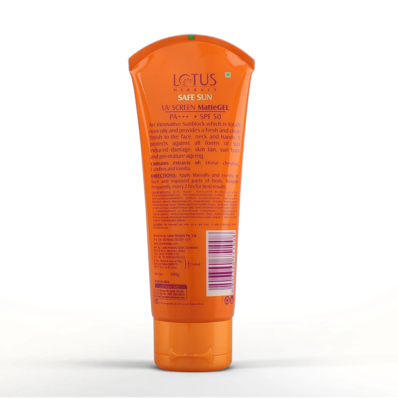 Lotus Safe Sun UV Screen MatteGEL Sunscreen SPF 50 PA+++ 100g is your ultimate companion for advanced sun protection. This innovative gel-based sunscreen offers a perfect blend of SPF 50 and a high PA+++ rating to effectively shield your skin from the harmful effects of UV rays. With its lightweight and non-greasy formula, it provides a matte finish that lasts throughout the day. Lotus Safe Sun UV Screen MatteGEL Sunscreen is your ideal choice for a comfortable and protected outdoor experience.