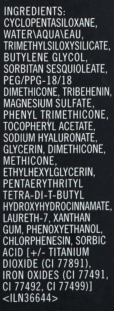 Water, Cyclopentasiloxane, Trimethylsiloxysilicate, Butylene Glycol, Sorbitan Sesquioleate, PEG/PPG-18/18 Dimethicone, Tribehenin, Magnesium Sulfate, Phenyl Trimethicone, Tocopheryl Acetate, Sodium Hyaluronate, Glycerin, Dimethicone, Methicone, Dimethicone Crosspolymer, Ethylhexylglycerin, Pentaerythrityl Tetra-Di-T-Butyl Hydroxyhydrocinnamate, Laureth-7, Xanthan Gum, Phenoxyethanol, Chlorphenesin, Sorbic Acid. May Contain: Titanium Dioxide (CI 77891), Iron Oxides (CI 77491, CI 77492, CI 77499).