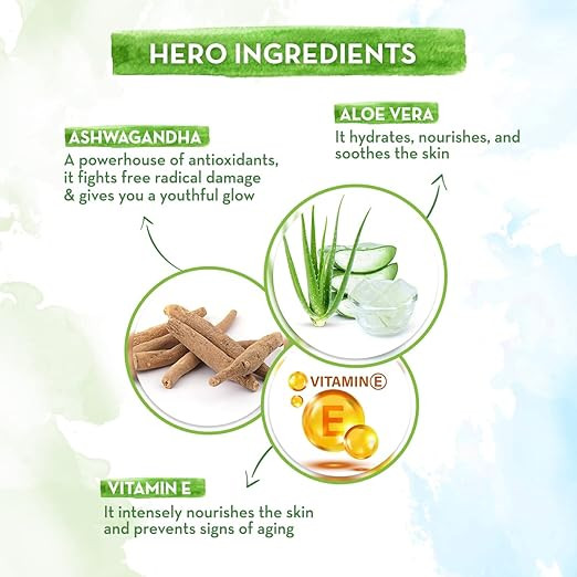 • Stress Relief: Ashwagandha, known for its adaptogenic properties, helps reduce stress, which can contribute to healthier-looking skin.