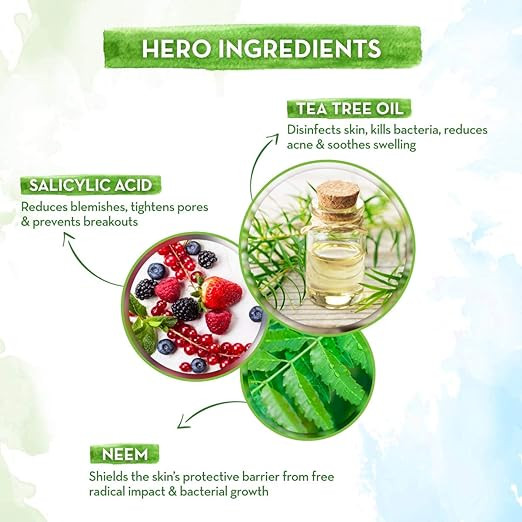 • Tea Tree Oil: Known for its antibacterial properties, tea tree oil helps combat acne-causing bacteria and soothes irritated skin.