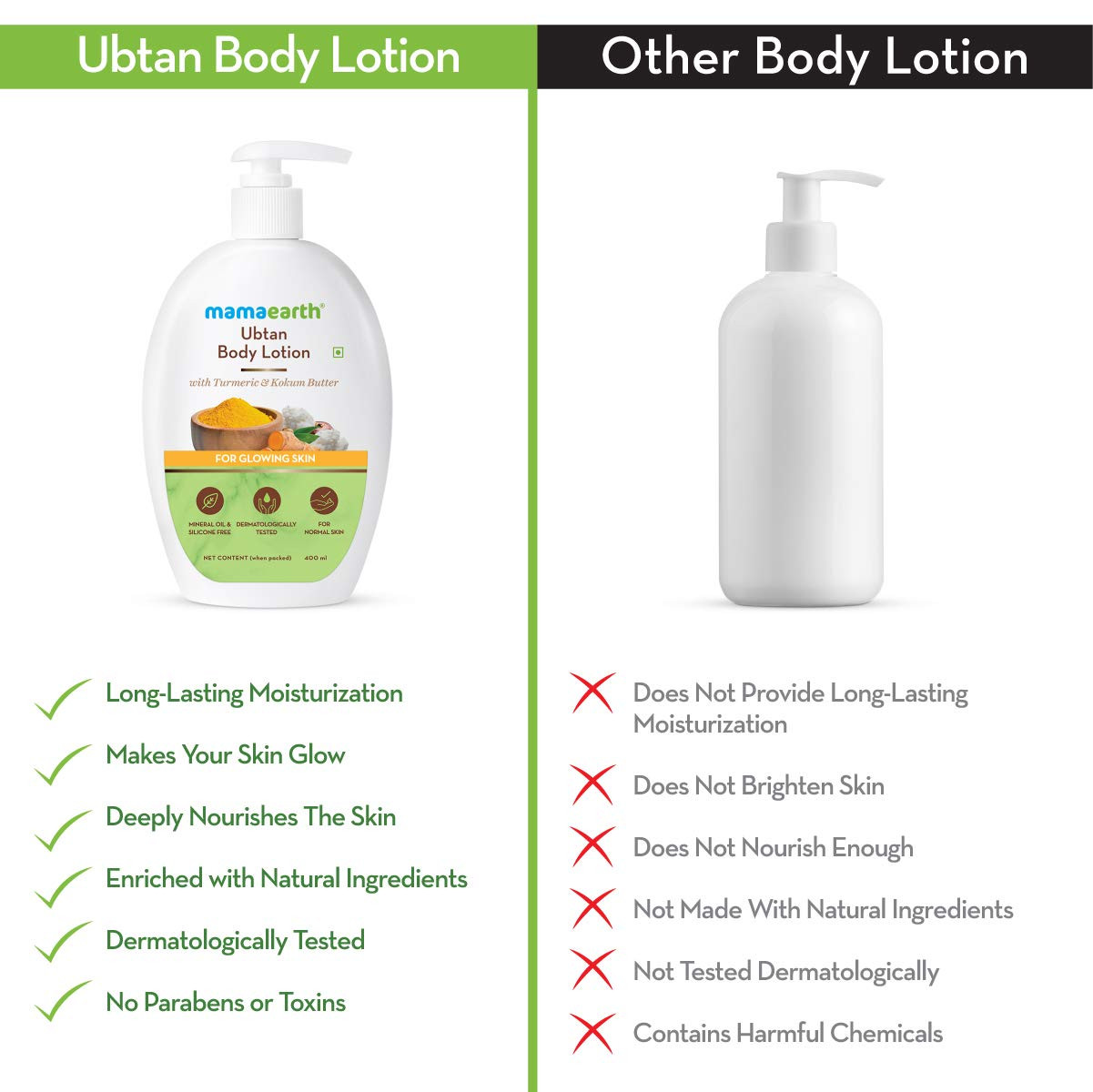 Elevate your skincare routine with Mamaearth's Ubtan Body Lotion. This generous 400 ml bottle is a luxurious elixir for your skin, designed to bring out its natural glow. Enriched with Turmeric and Kokum Butter, it deeply moisturizes while leaving your skin non-greasy and gloriously glowing. Experience the magic of Ubtan skincare in a convenient lotion form.