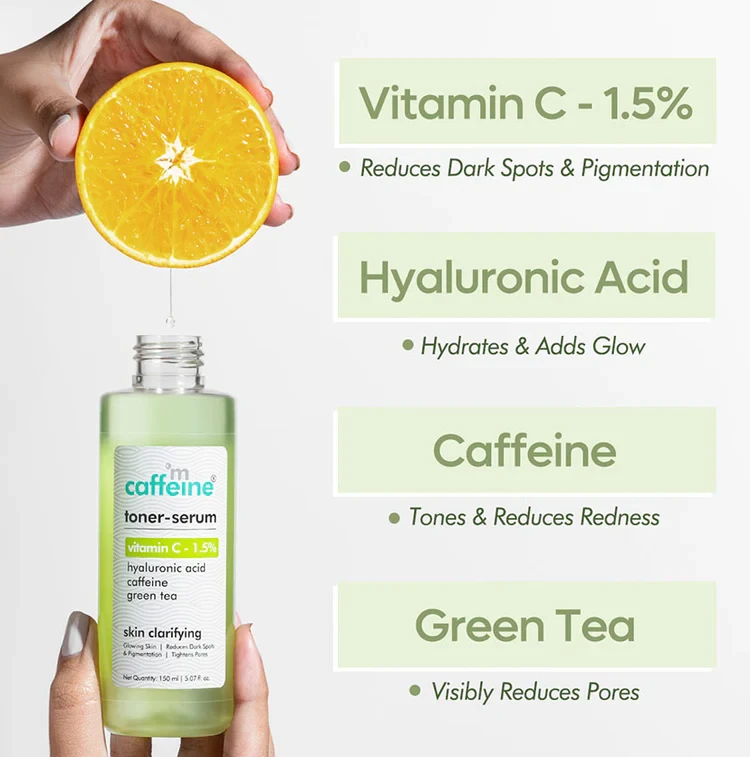 Experience the transformative power of mCaffeine 1.5% Vitamin C 2in1 Toner-Serum with Green Tea, a dynamic skincare solution that combines the benefits of a toner and serum in one. This 150 ml bottle is designed to unveil your skin's natural radiance, targeting dark spots while providing a refreshing and revitalizing sensation.