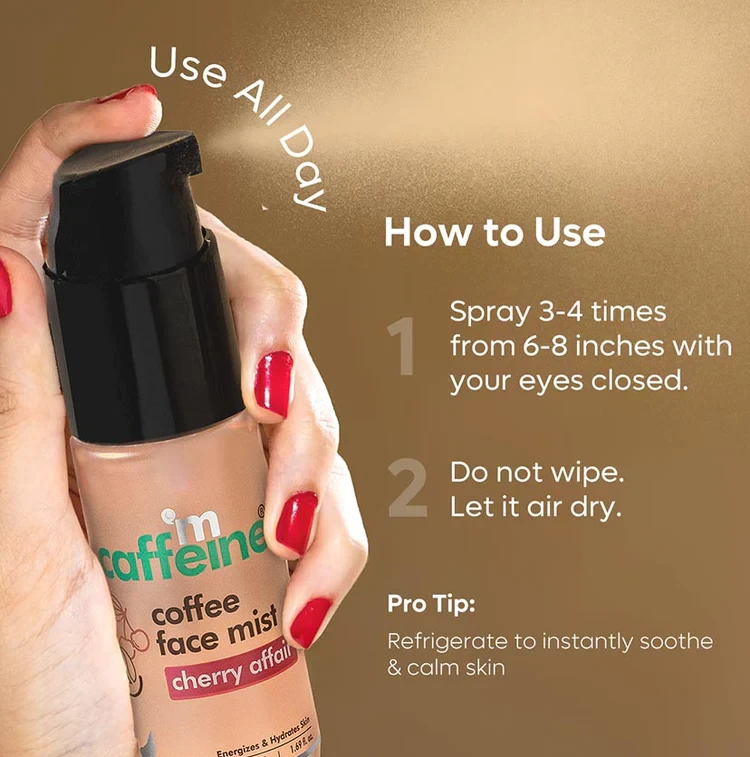 • Instant Glow: The infusion of coffee extracts in this face mist instantly revitalizes your skin, giving it a natural and healthy glow.