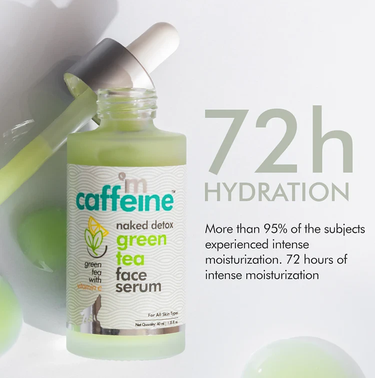 Elevate your skincare routine with mCaffeine Green Tea Face Serum for 72 Hrs Hydration with Hyaluronic Acid, and immerse your skin in the hydrating and calming benefits it deserves.