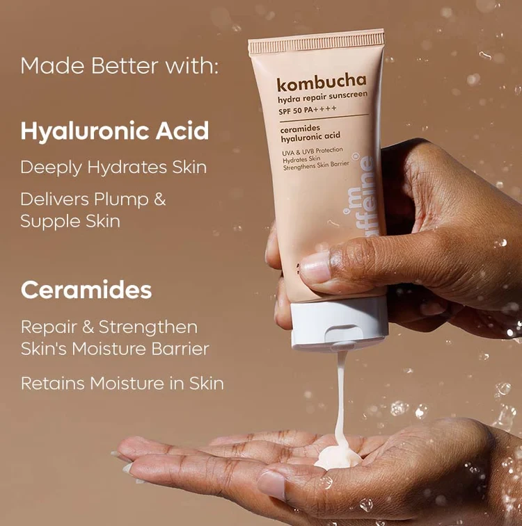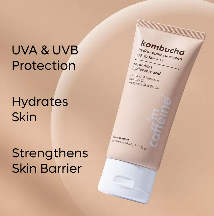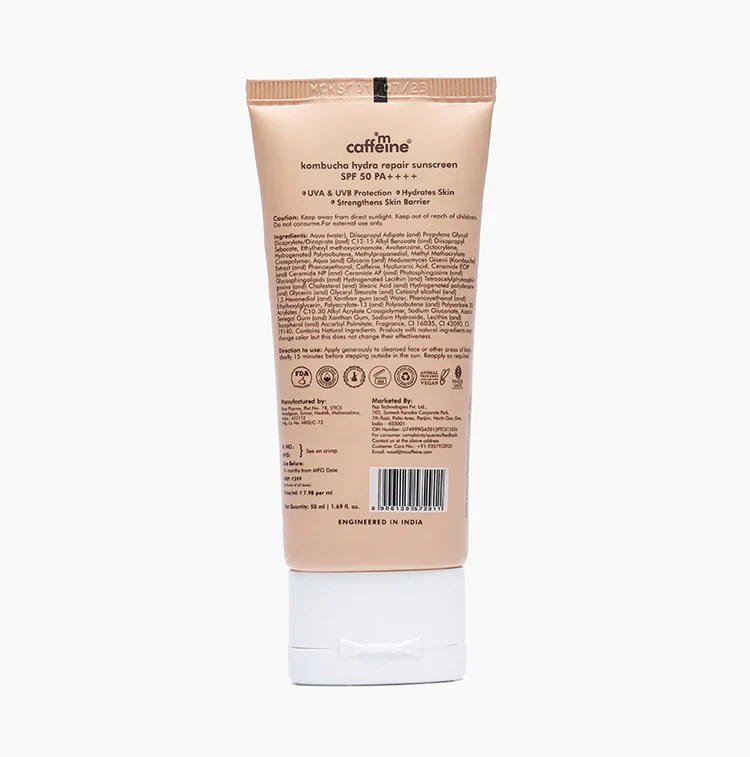 Unleash the power of holistic sun protection with mCaffeine Kombucha Hydra Repair Sunscreen SPF 50 PA++++ featuring Hyaluronic Acid & Ceramide. This innovative formula seamlessly blends Kombucha extracts with SPF 50, Hyaluronic Acid, and Ceramide, creating a protective shield against harmful rays. Nurture your skin with hydration and repair while ensuring it stays safeguarded and revitalized.