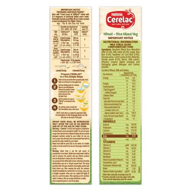 Nourish your baby's growth and development with the wholesome blend of grains and mixed vegetables in Nestle Cerelac Baby Cereal with Milk Wheat Rice Mixed Veg. Trust in the best online pharmacy service with MediLife.