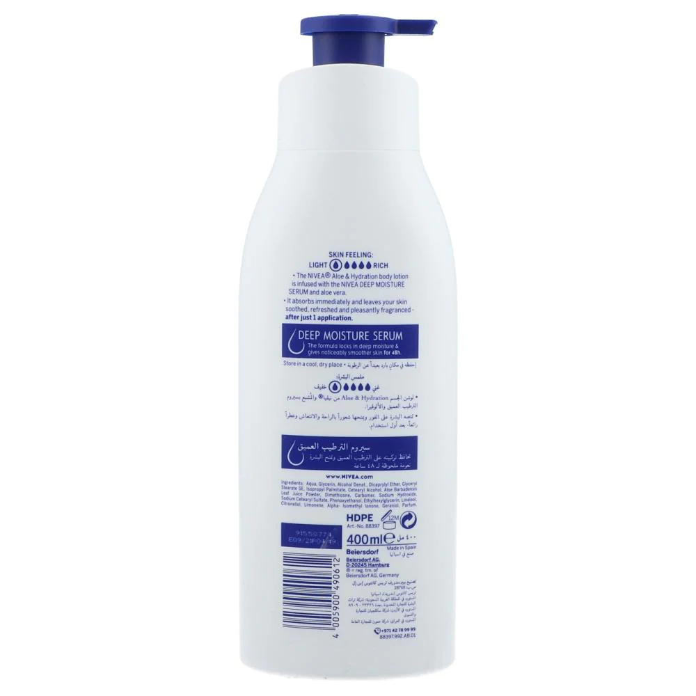 Experience the soothing and hydrating benefits of Nivea Aloe Hydration Body Lotion in a generous 400ml size. This dermatologically tested lotion is enriched with aloe vera to provide your skin with deep and long-lasting hydration. Say goodbye to dryness and hello to nourished, refreshed skin.