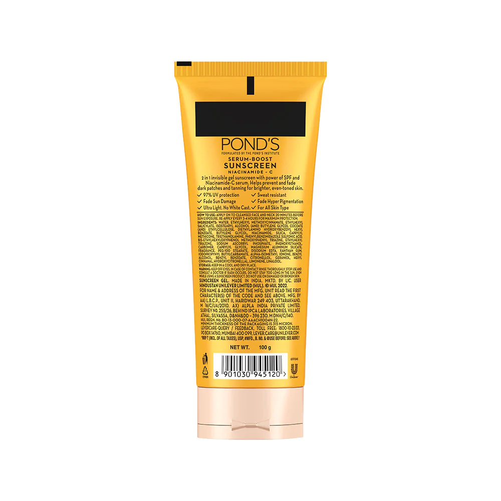 Pond's Serum Boost Sunscreen Gel with SPF 50 in a 100g tube is your ultimate sun protection partner. This sunscreen provides enhanced UV protection and nourishes your skin with a lightweight, non-greasy formula, promoting a radiant and healthy complexion. Elevate your sun protection game while caring for your skin's well-being.